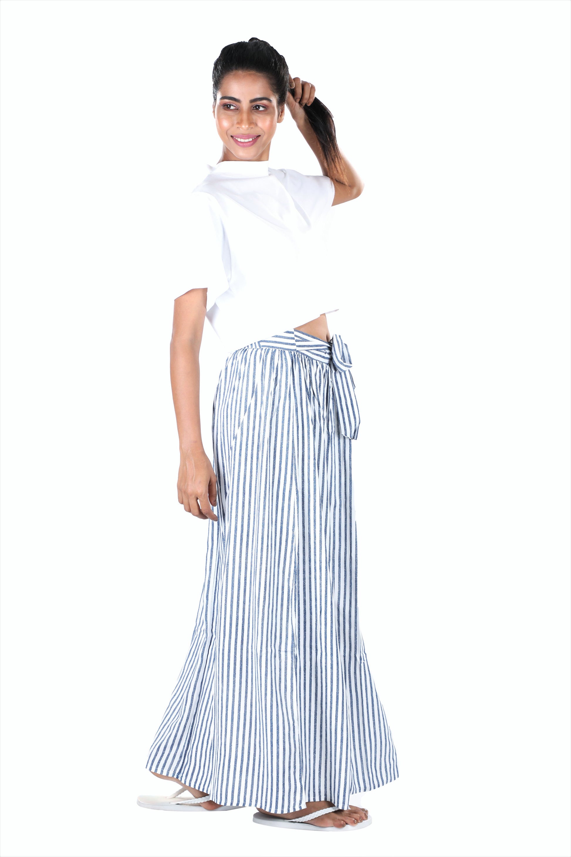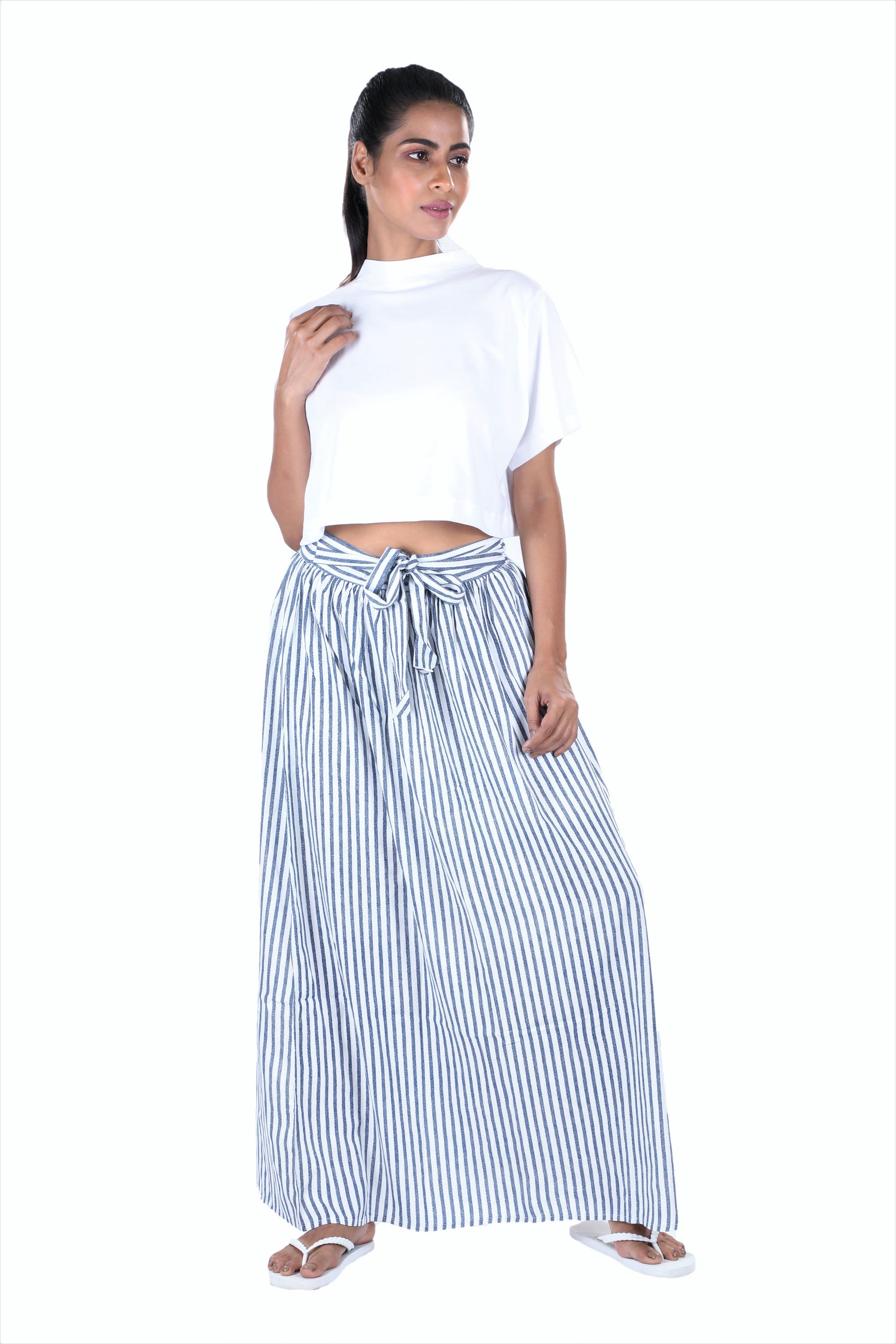 If you are tired of wearing the same old trousers everyday then this Blue White Striped Skirt from S&F is the perfect pick for you. Crafted from modal fabric this skirt ensures both comfort and style. This easy-breezy skirt comes with a self-fabric belt, back elastic waist with knee length lining.